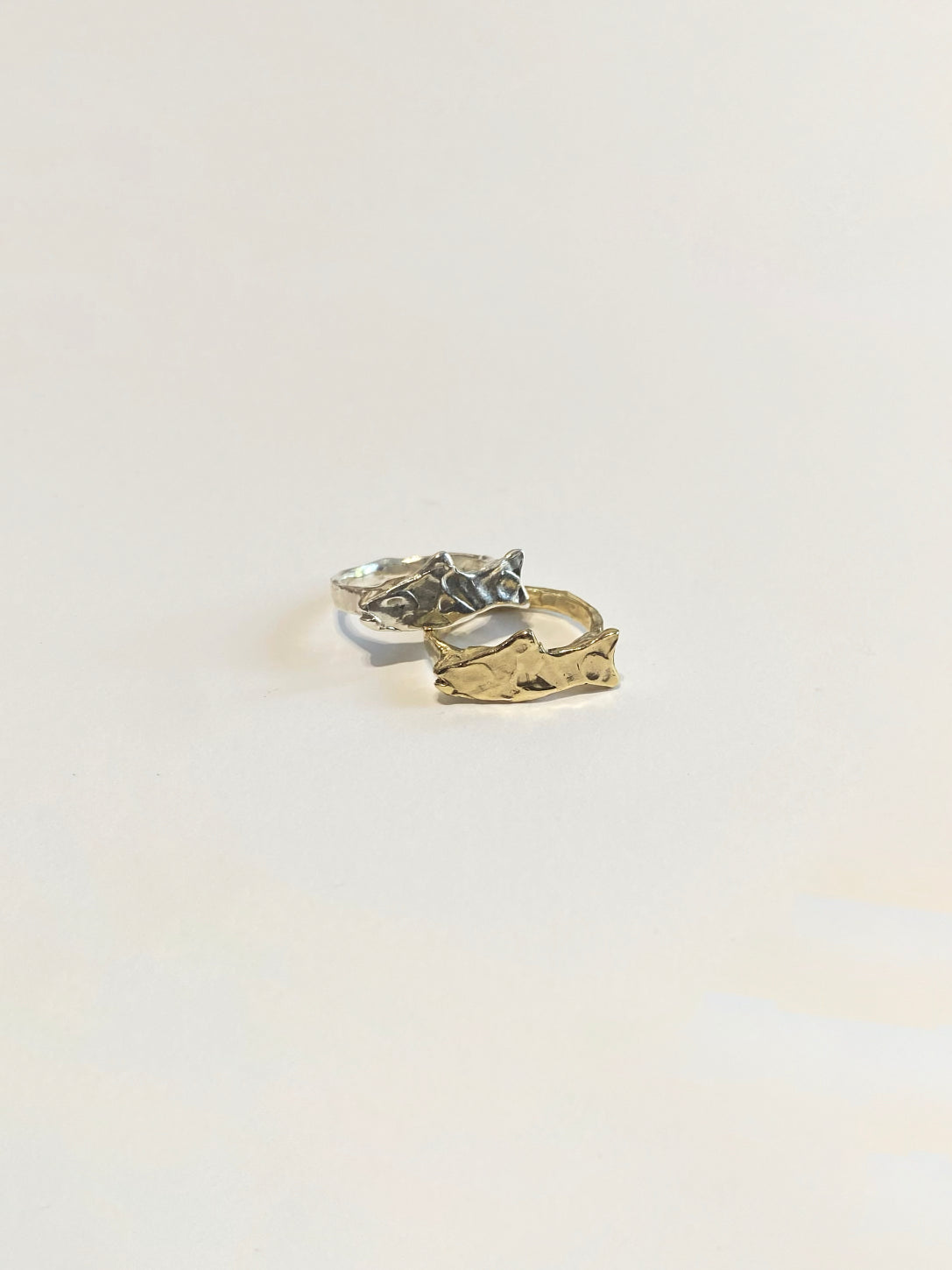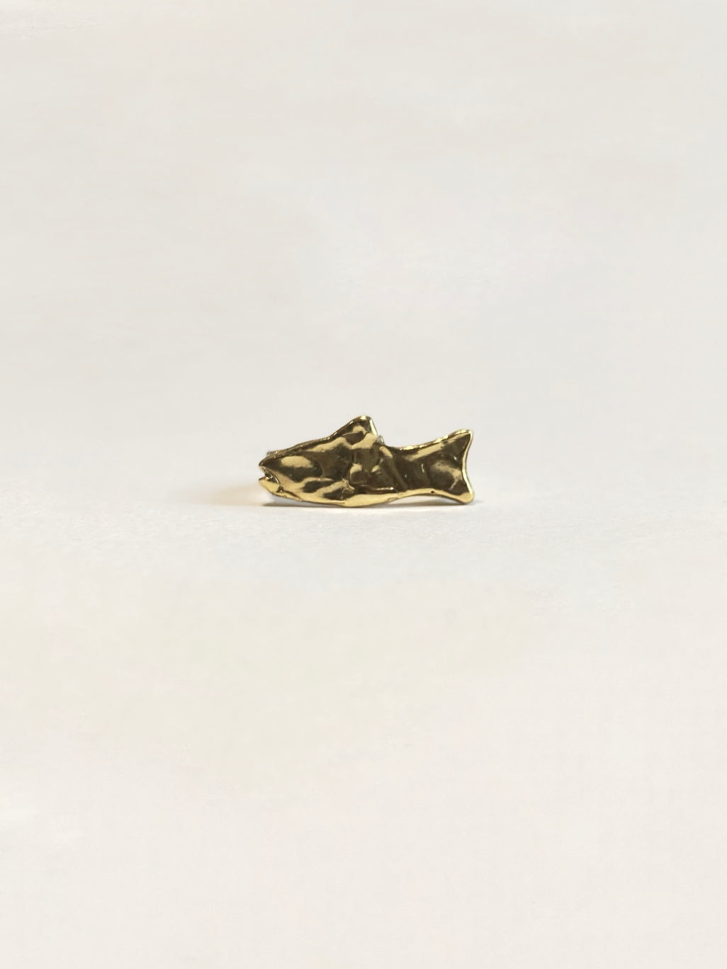 Our fish ring is a handmade piece of jewellery, styled after a classic trout (or salmon - think freshwater fish in the Great Lakes region). We meticulously carve our rings out of jeweller’s wax to achieve our perfect design, of which is then cast into the metal of your choosing (brass, sterling silver, or solid gold). The entire surface (including the band) of our handcrafted fish ring has a rippling molten effect, mimicking that of the water fish naturally call home. With a slim profile, our fish ring is great to stack with your other gold and sterling silver rings.